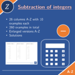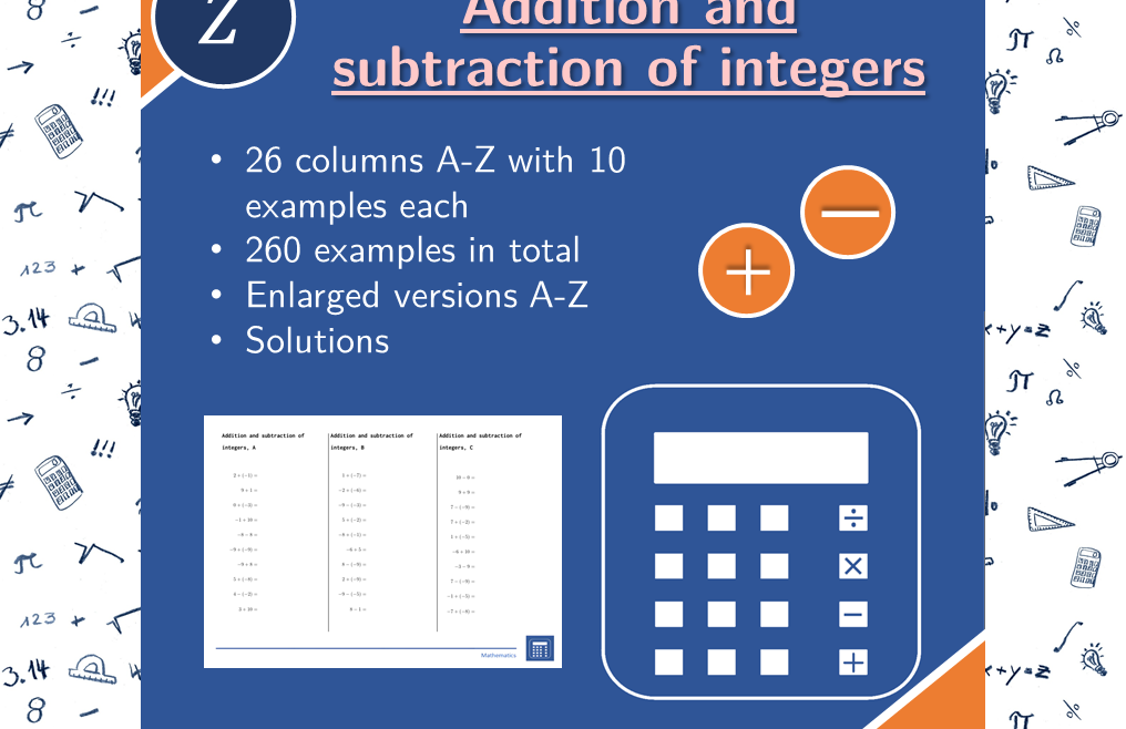The material contains a total of 26 columns (A-Z) with 10 exercises for Addition and subtraction of integers, including the solutions to these columns. It also includes all 26 columns (A-Z) with an enlarged font size of 20.
