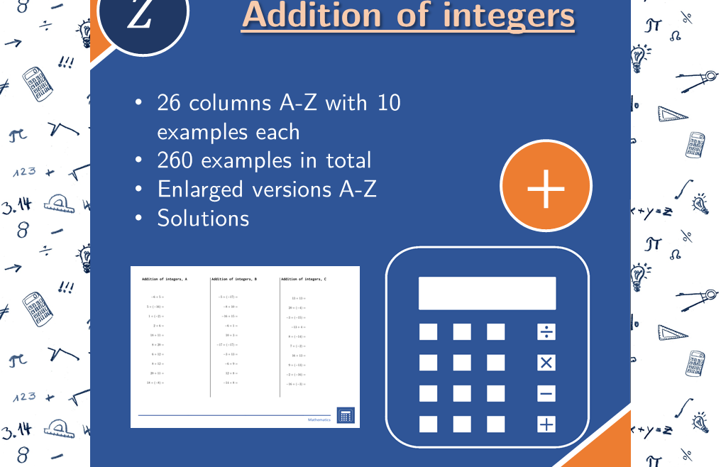 The material contains a total of 26 columns (A-Z) with 10 exercises for Addition of integers, including the solutions to these columns. It also includes all 26 columns (A-Z) with an enlarged font size of 20.