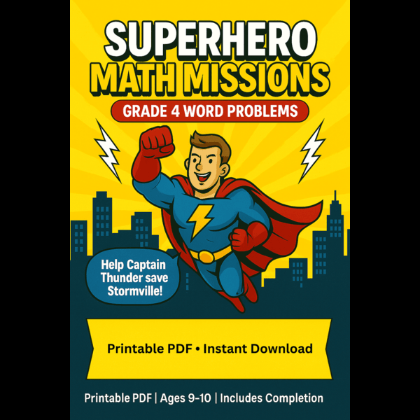 This Grade 4 printable worksheet pack includes 7 superhero-themed word problems tied to a fun, comic-style story.
