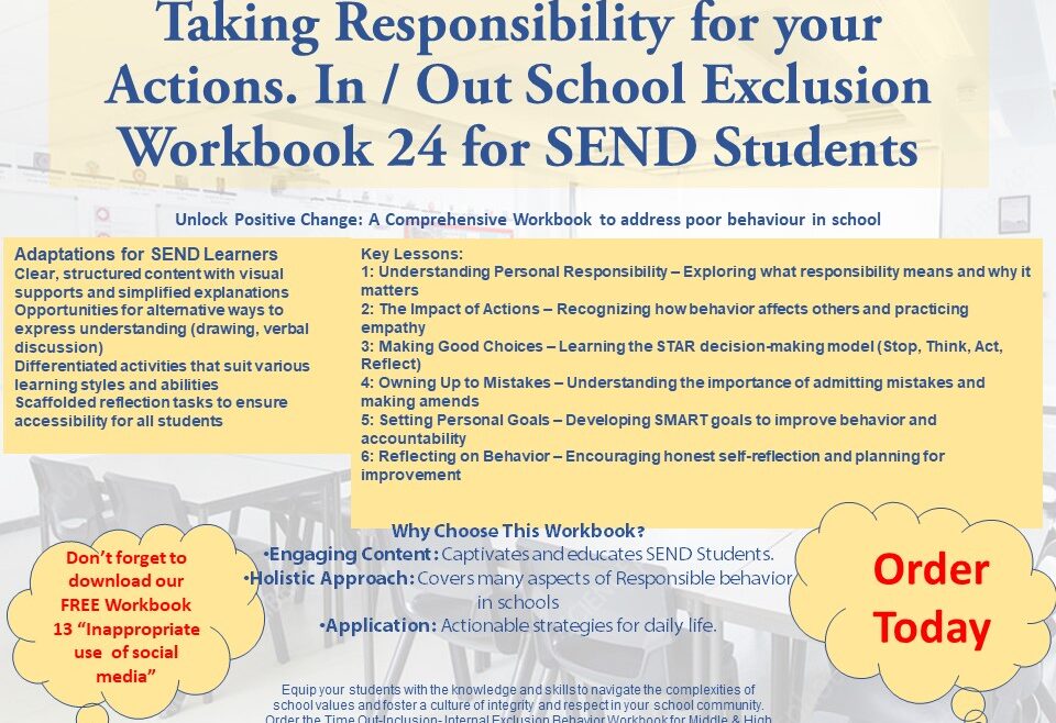 This Internal Exclusion Workbook is specially designed for students with SEND profiles to help them reflect on their behavior and understand the importance of taking responsibility. Through simplified language, structured lessons, and supportive activities, students will explore how their actions affect others, learn how to make better choices, and build the skills needed for a successful return to class.