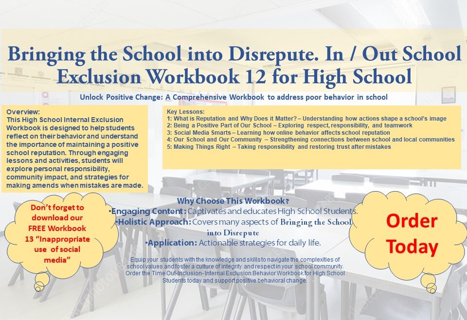 This High School Internal Exclusion Workbook is designed to help students reflect on their behavior and understand the importance of maintaining a positive school reputation. Through engaging lessons and activities, students will explore personal responsibility, community impact, and strategies for making amends when mistakes are made.