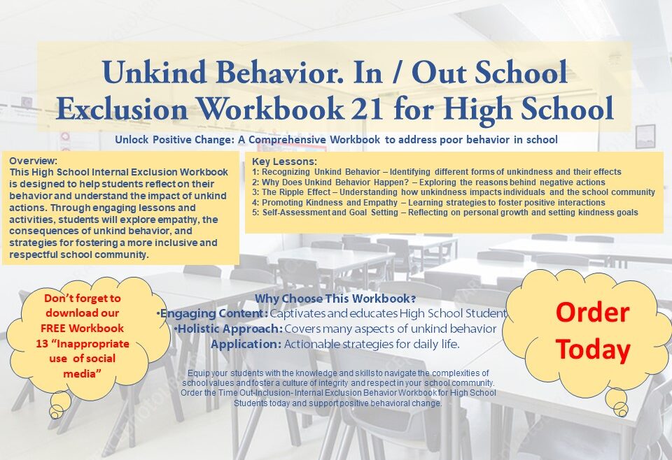 This High School Internal Exclusion Workbook is designed to help students reflect on their behavior and understand the impact of unkind actions. Through engaging lessons and activities, students will explore empathy, the consequences of unkind behavior, and strategies for fostering a more inclusive and respectful school community.