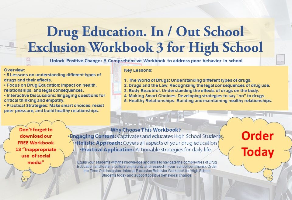 This High School Internal Exclusion Workbook helps students understand the risks associated with drug use and the importance of making informed, responsible choices. Through engaging lessons and activities, students explore the impact of drugs on health, relationships, and their future while developing resilience and strategies to resist peer pressure.