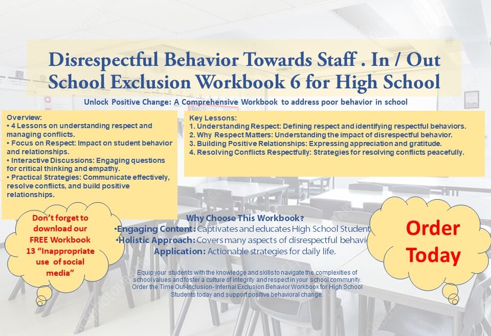 This High School Internal Exclusion Workbook is designed to help students reflect on their behavior and understand the importance of respect in social interactions. Through engaging lessons and activities, students will explore the impact of disrespectful behavior, develop empathy, and learn strategies for fostering positive relationships with staff and authority figures.