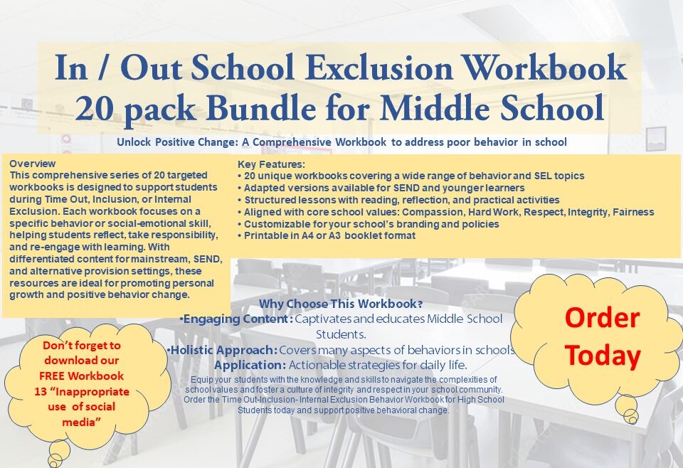 Unleash your students’ potential with our expertly crafted workbooks. This bundle is designed specifically for Middle School students serving time in Time Out / Internal Exclusion / Isolation / Remove Room / Seclusion / Reflection Room or undergoing suspension from school, each resource is tailored to help students focus on and address the consequences of their behavior. By understanding the causes and effects of their actions, students can challenge and develop strategies for creating a more positive environment for themselves and others.