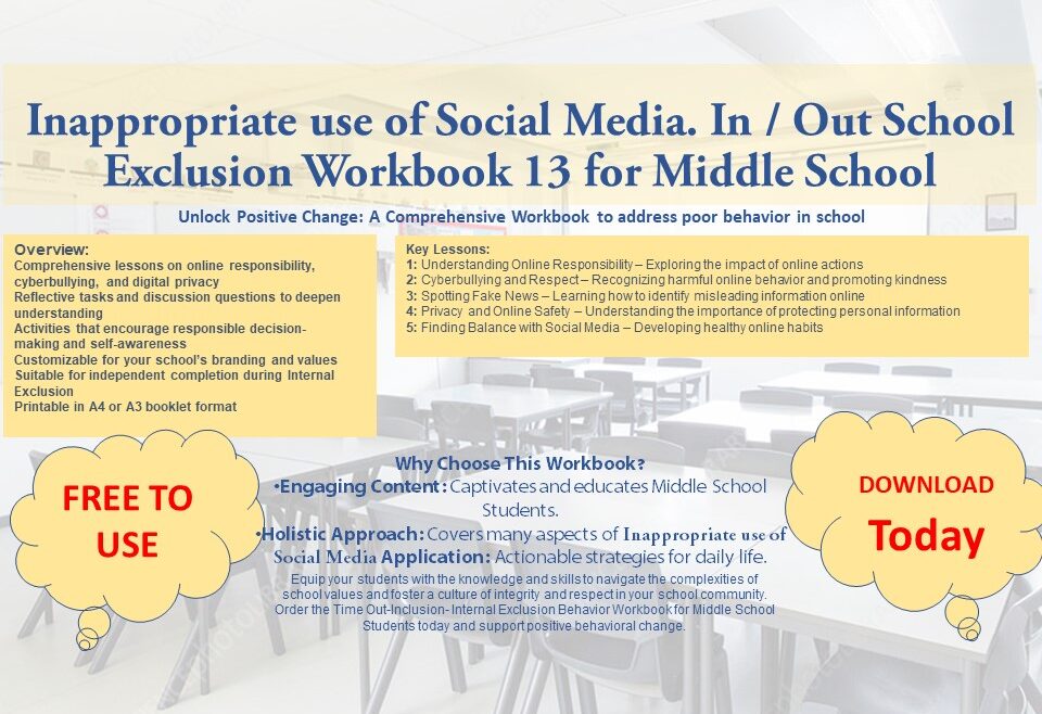 In / Out School Suspension Workbook 13. Inappropriate use of Social Media. (FREE) (US Middle school)
