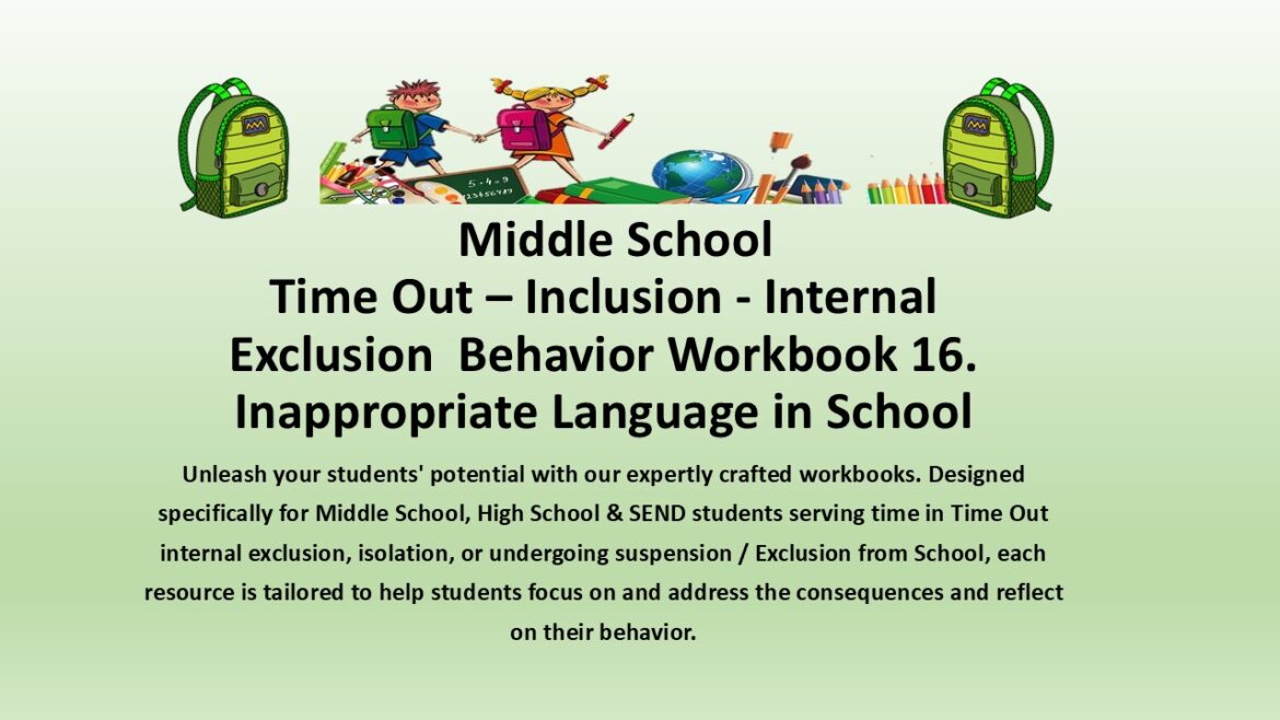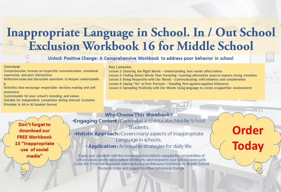 This Middle School Internal Exclusion Workbook is designed to help students reflect on their language choices and understand the impact of words. Through engaging lessons and activities, students will explore the power of language, develop strategies for respectful communication, and learn how to express emotions in a positive way.