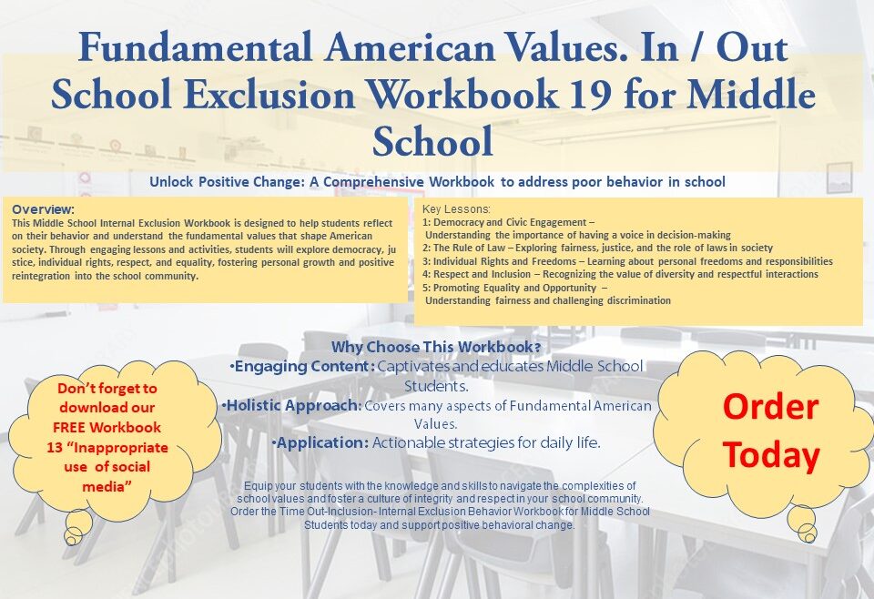 This Middle School Internal Exclusion Workbook is designed to help students reflect on their behavior and understand the fundamental values that shape American society. Through engaging lessons and activities, students will explore democracy, justice, individual rights, respect, and equality, fostering personal growth and positive reintegration into the school community.