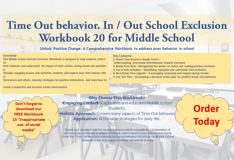 This Middle School Internal Exclusion Workbook is designed to help students reflect on their behavior and understand the impact of their actions during break and lunchtime. Through engaging lessons and activities, students will explore how their choices affect themselves and others, develop strategies for positive interactions, and learn how to create a respectful and inclusive school environment.