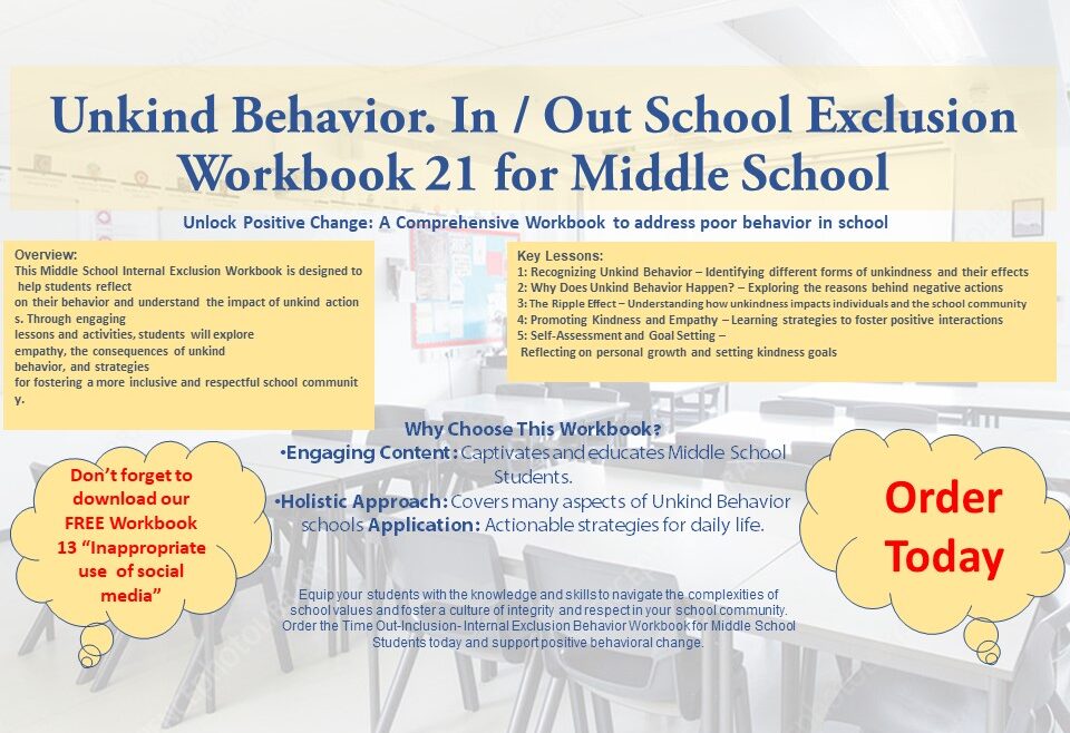 This Middle School Internal Exclusion Workbook is designed to help students reflect on their behavior and understand the impact of unkind actions. Through engaging lessons and activities, students will explore empathy, the consequences of unkind behavior, and strategies for fostering a more inclusive and respectful school community.