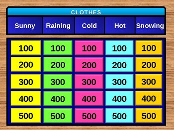 This game is for practicing the Present Continuous and names of clothes. Children choose the category and the number of points, then complete the sentences looking at the pictures and answer the questions