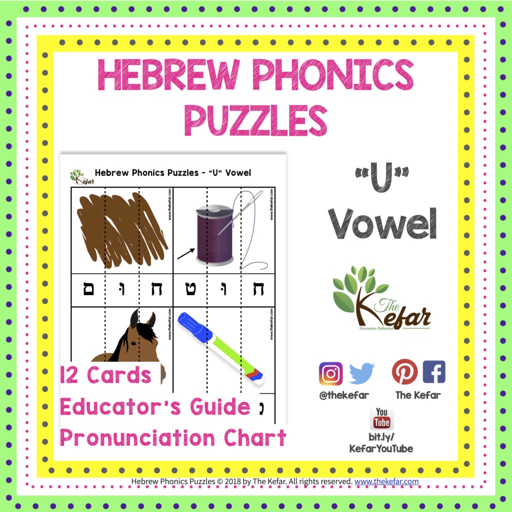 These Hebrew Vowels & Phonics Puzzles are a fantastic tool for teaching Hebrew reading, spelling, and vocabulary. This packet covers a “U” vowel – shuruk – and includes 12 puzzles, a comprehensive educator’s guide that includes a quick & easy Hebrew reading tutorial + activity suggestions, and a pronunciation chart that lists each vocabulary word in Hebrew and English, along with its transliteration and pronunciation.